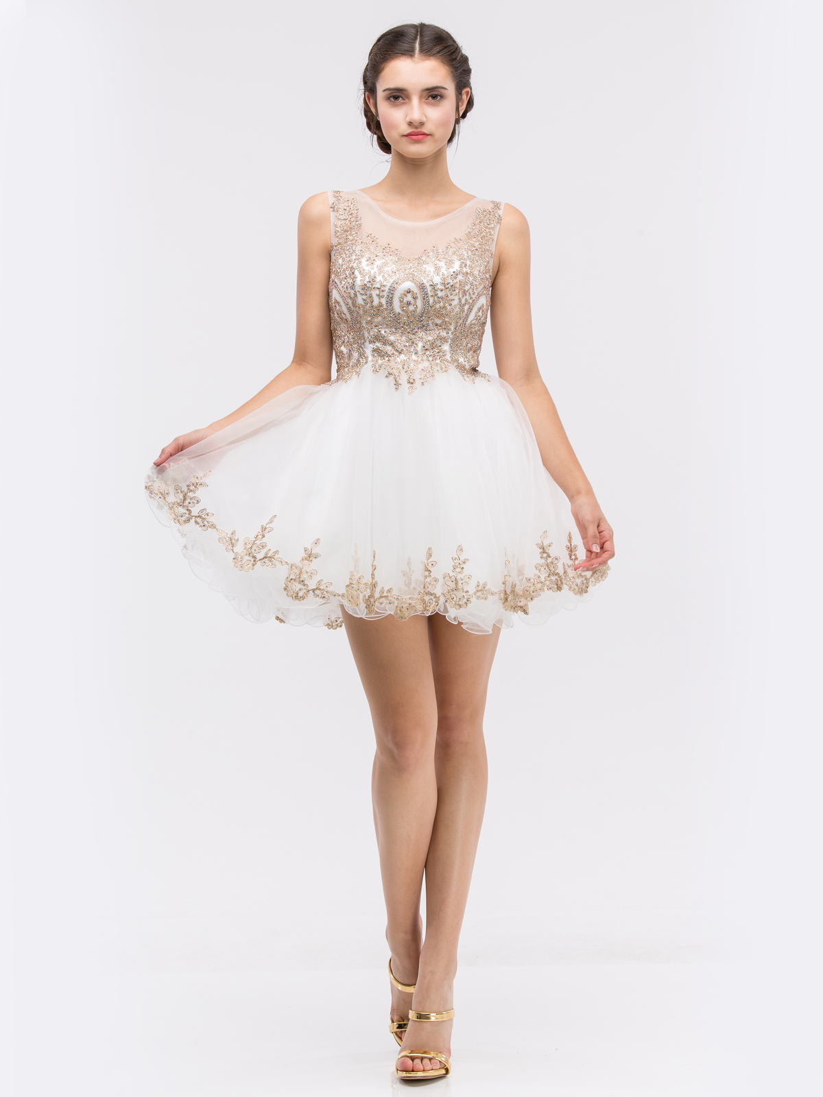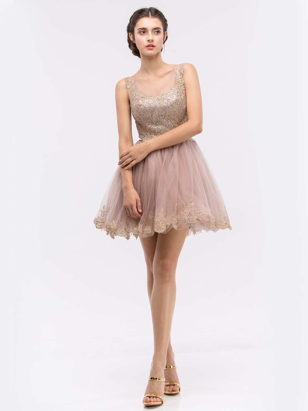 This fit & flare style cocktail dress features illusion neckline with sparkling bead detail the embroidered bodice. Wired-trim net overlay skirt with embroidered detail complete the style.