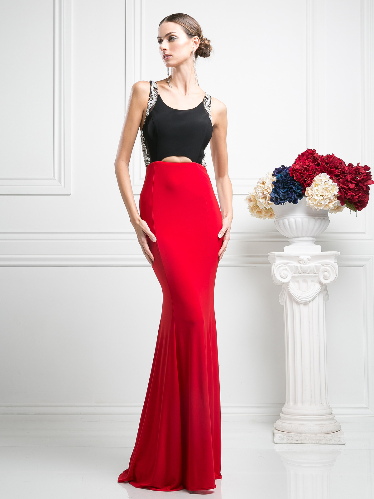 A round neck with sequins on the sleeves and the back of the bodice which is mostly open. There is a slight cutout at the midriff and a floor length skirt with a sweeping train.