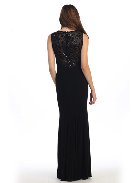 This elegant jersey dress with sheer design on the neckline and the mid-section. Sequined illusion back with slit completed the style.