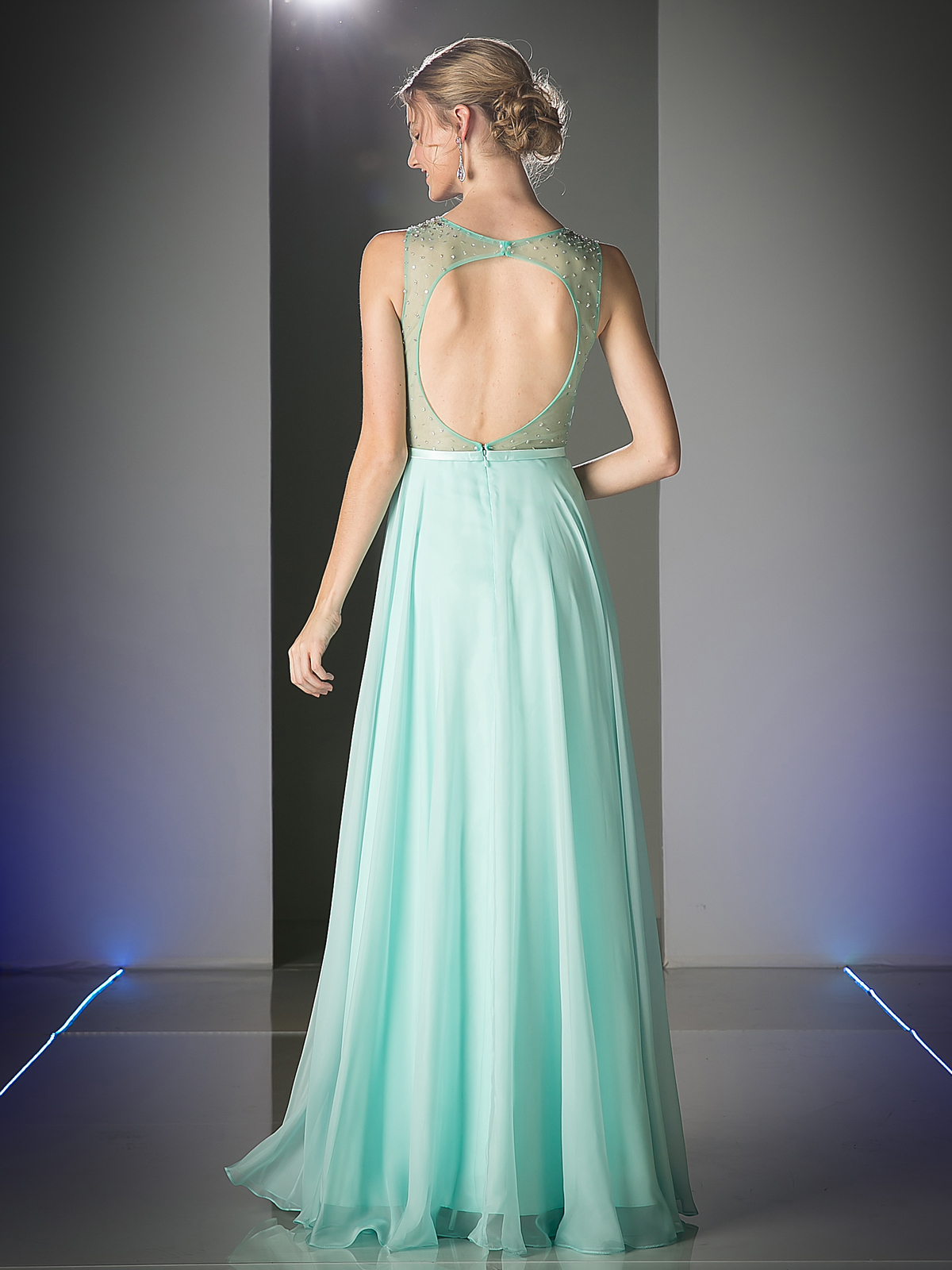 Illusion bodice with sparkling details on the shoulder tops and the sheer bodice. The satin sash at the waistline starts the flow of the floor length chiffon skirt.