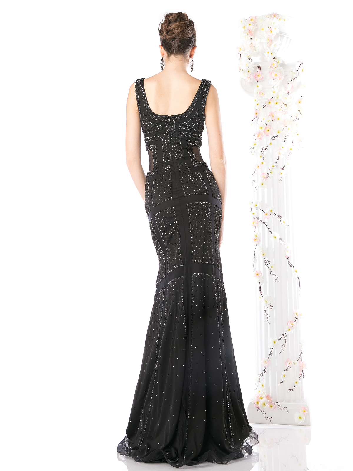 Classy and elegant. This sleeveless v-neck evening dress with sparkling jewels twinkle throughout the dress. Square cutout on the side of the waist with flare hem and slight train completed the look.