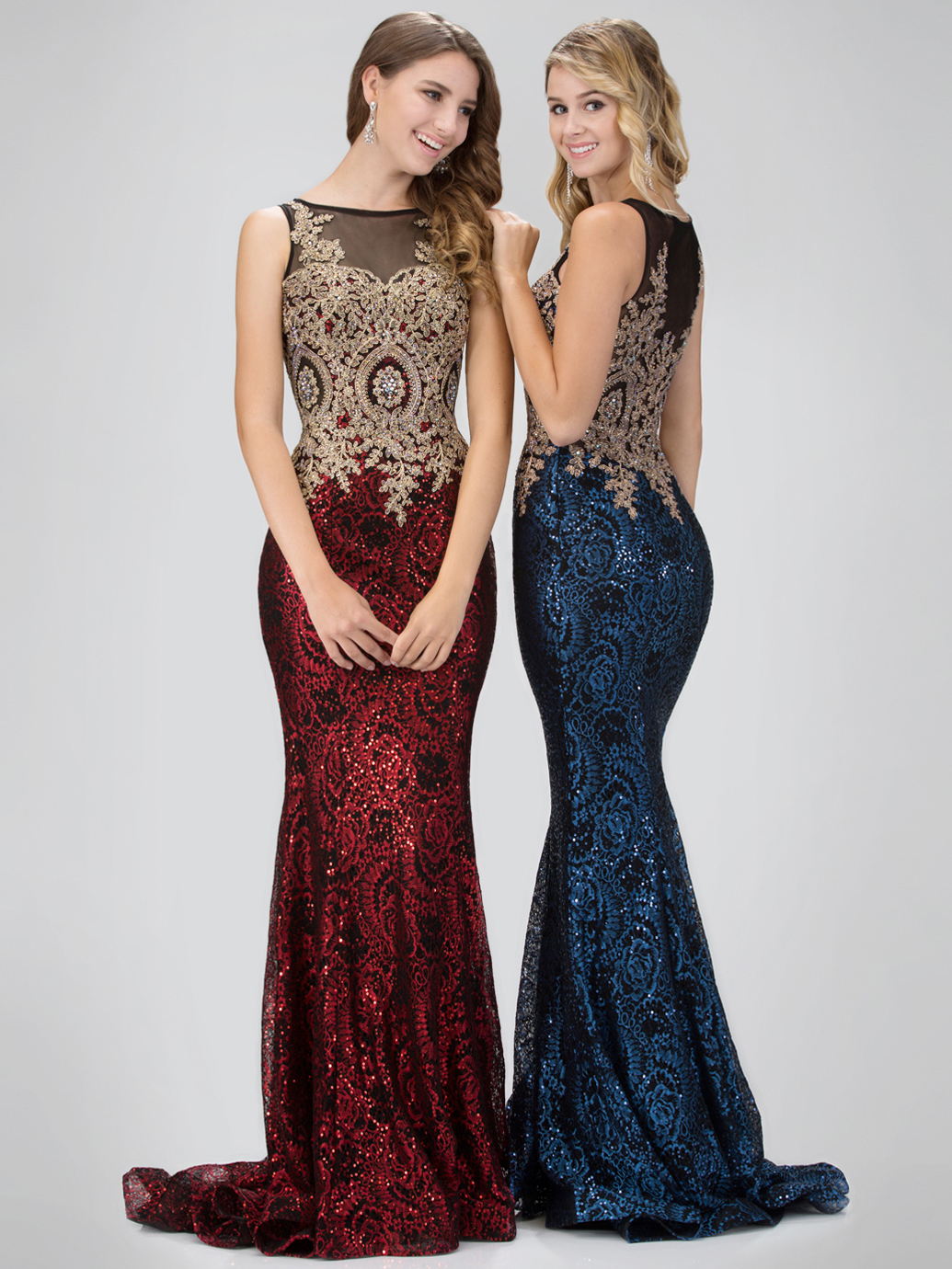 A floor length gown with sweeping train. The skirt is sparkling with sequins and glitter. The bodice has a lace applique and is accented with rhinestone jewels around the waist. A sheer high neckline completes the look. -Approximate 60 inches from shoulder to hem. -Zipper entry. -Fully lined. -Polyester. -Imported.