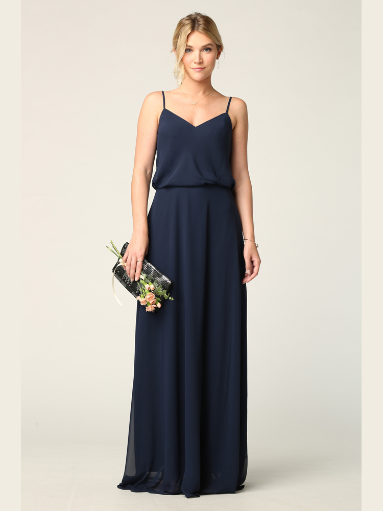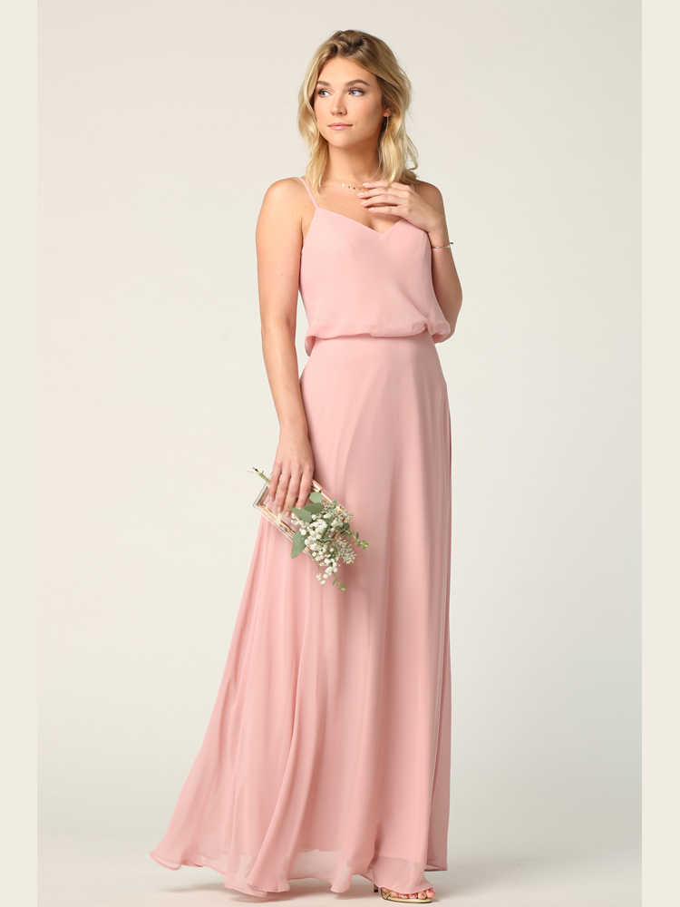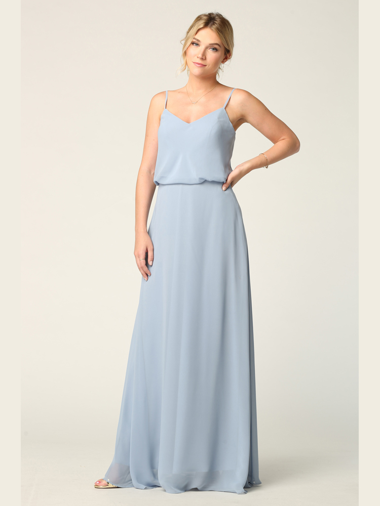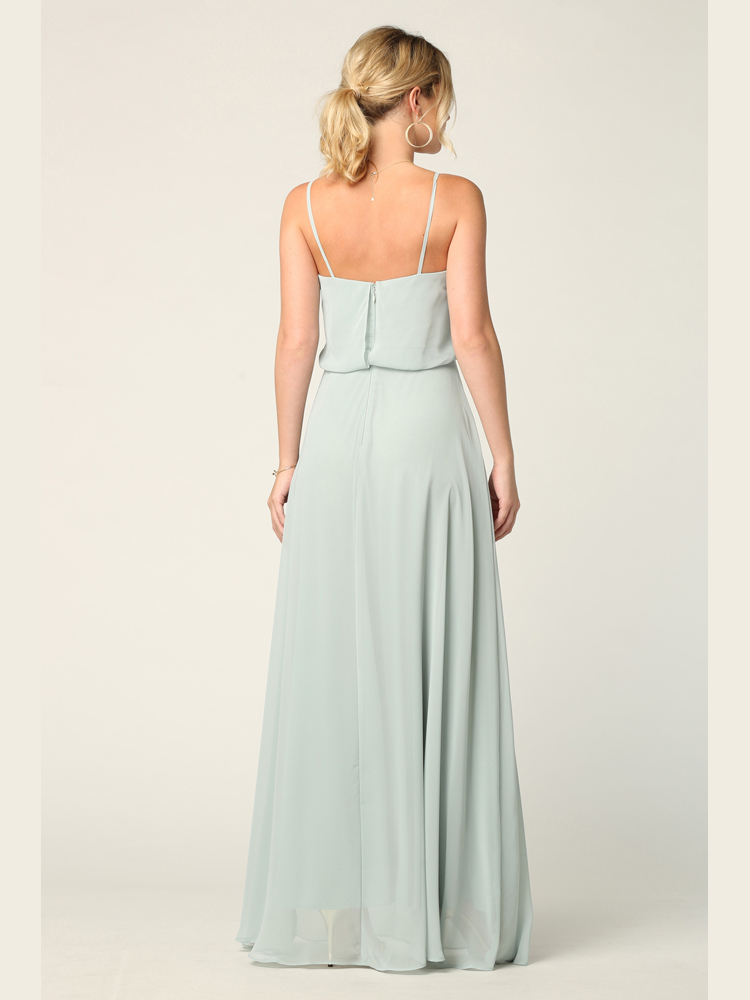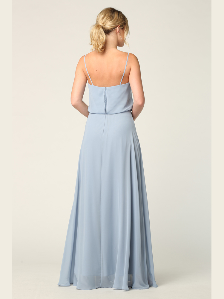 Simple and elegant bridesmaid dress features spaghetti strap with blouson top. Lightweight chiffon floor length finished the look.