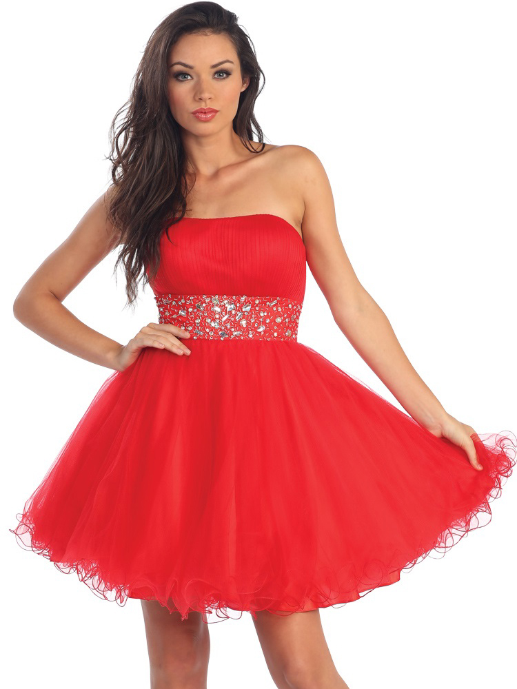 This cute and flirty party dress features a pleated bust and thick ban empire waist adorned with dazzling beads and jewels. A layered wire-edge mesh skirt completes the look. - Zipper entry. - Built in cup. - Approx. 27 in. from underarm to hem. - Fully lined. - 100% polyester. - Imported.