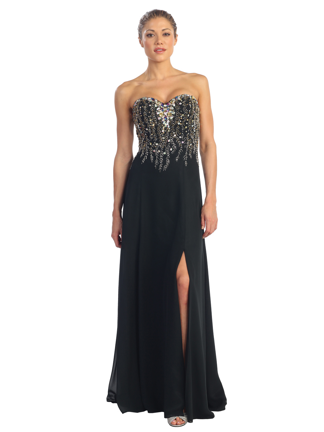 Elegant strapless evening dress with sparkling beads detail the sweetheart neckline and strands of beads and sequins adorn the bodice. One side slit and sweeping floor length enhance the classic look. -Approx. 60 inches from underarm to hem. -Fully lined. -Polyester. -Imported