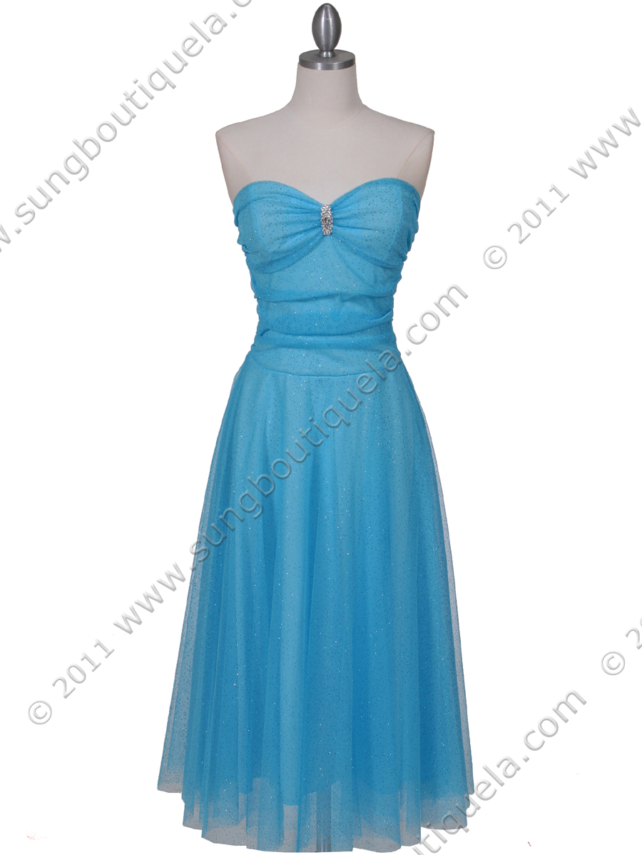 This beautiful tea length strapless mesh dress features sweetheart neckline, shirred bust with rhinestone pin. Stretchy top band and shirred bodice give this knit mesh dress a secure fit. Finished with a double-layer glittering lace skirt add a sense of elegant. - Matching shawl included. - Pull on style. No zipper. - Padded bodice. - Approx. 38 in. from underarm to hem. - Fully lined. - 100% polyester. - Made in USA.