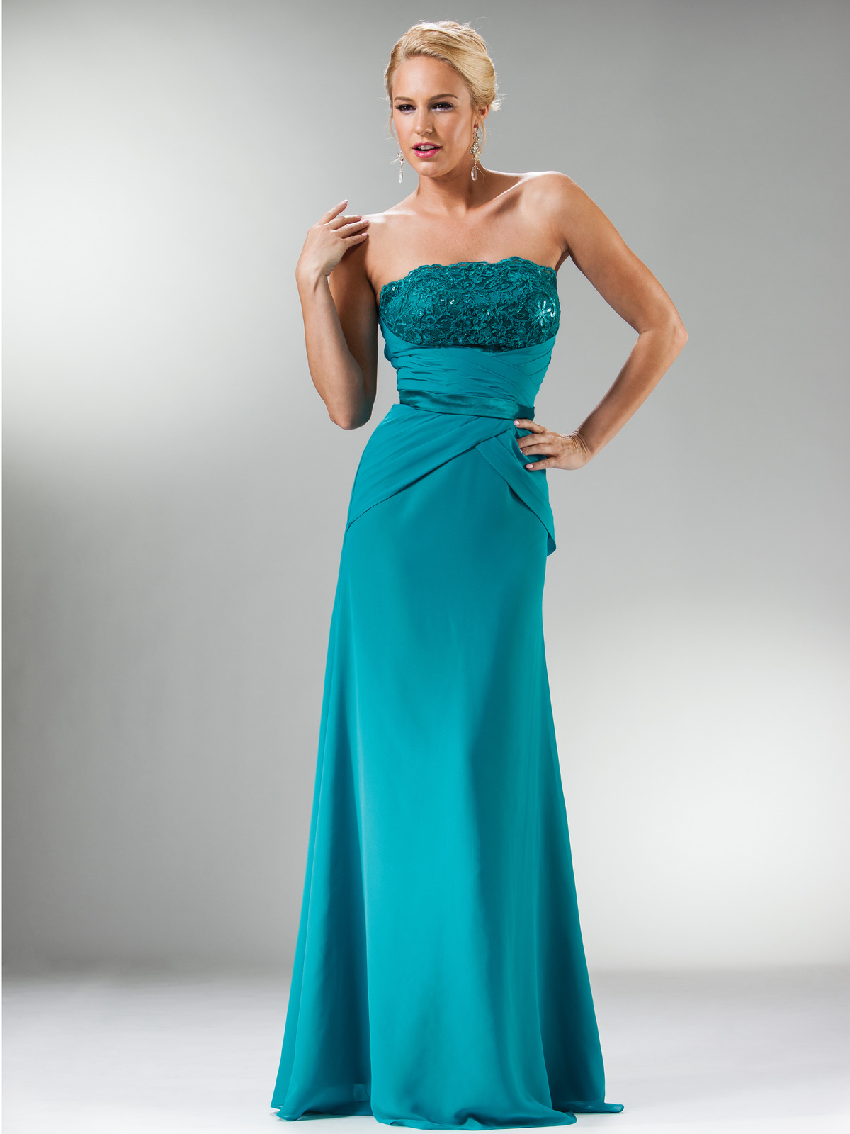 Strapless neckline with fitted lace bodice sparkling with scattered sequins. Ruched wrap waist before tracing the hips in this ultra feminine gown finished with a soft and silky chiffon A-line skirt. -Approximate 60 inches from shoulder to hem. -Zipper entry. -Fully lined. -Polyester. -Imported.