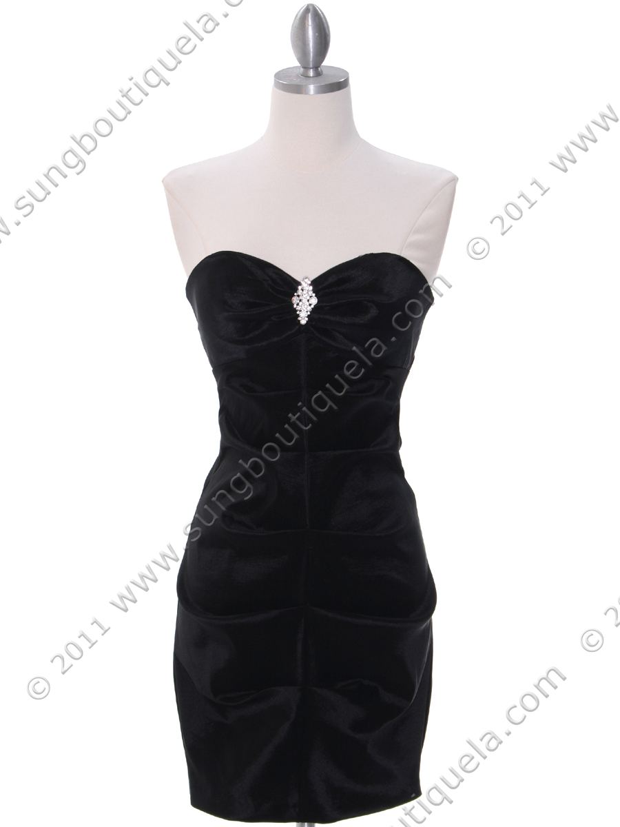 This sexy strapless cocktail dress features stretch taffeta with sweetheart neckline. Sparkling rhinestone pin adorns the bodice.