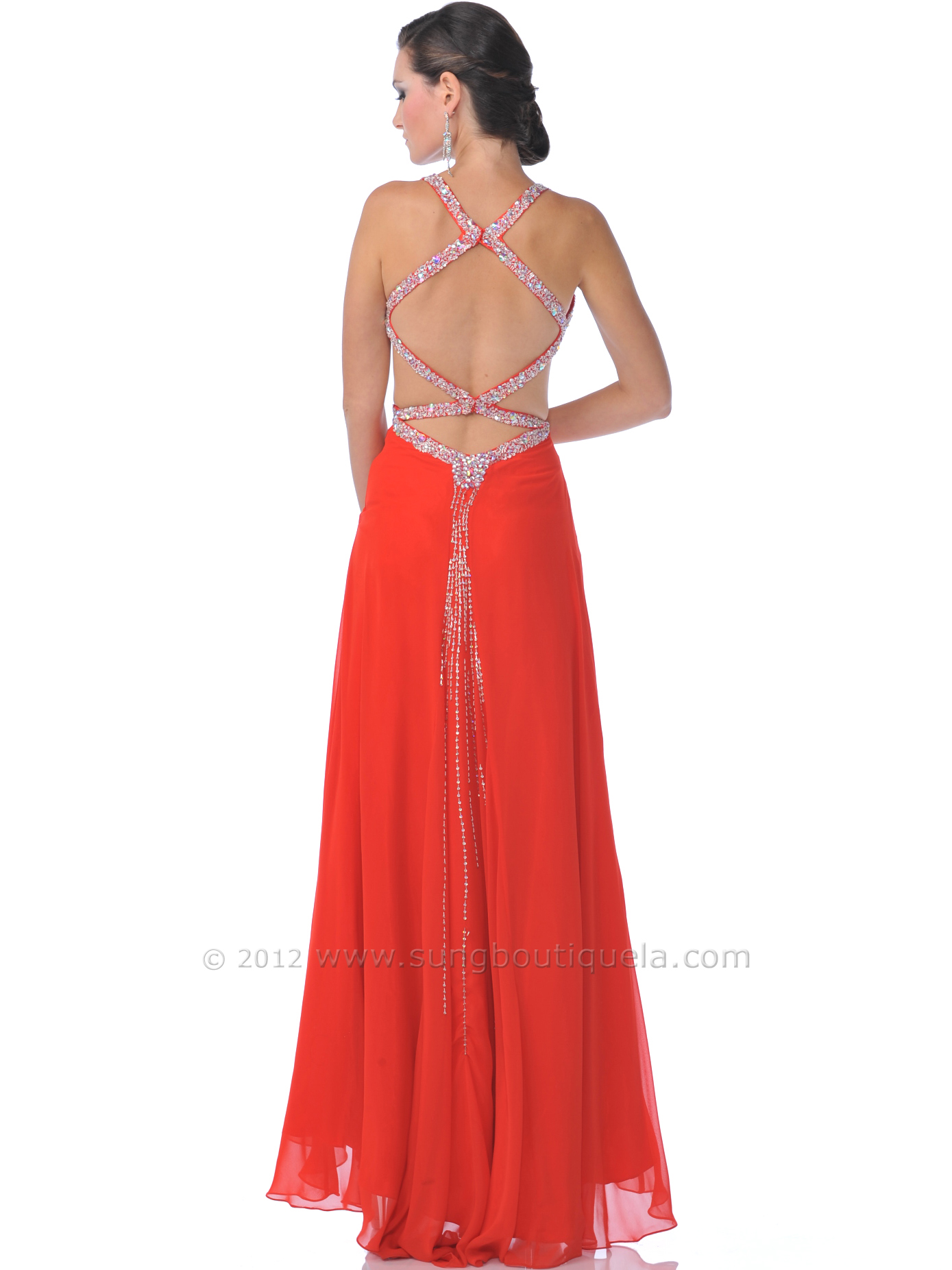 Gathered bust line is accented by jewel encrusted straps with crisscross back and creates daring side cut outs. Plunging back detail with jewels give this prom dress a show stopping silhouette. - Zipper entry. - Built in cup. - Approx. 62 in. from shoulder to hem. - Polyester. - Imported.