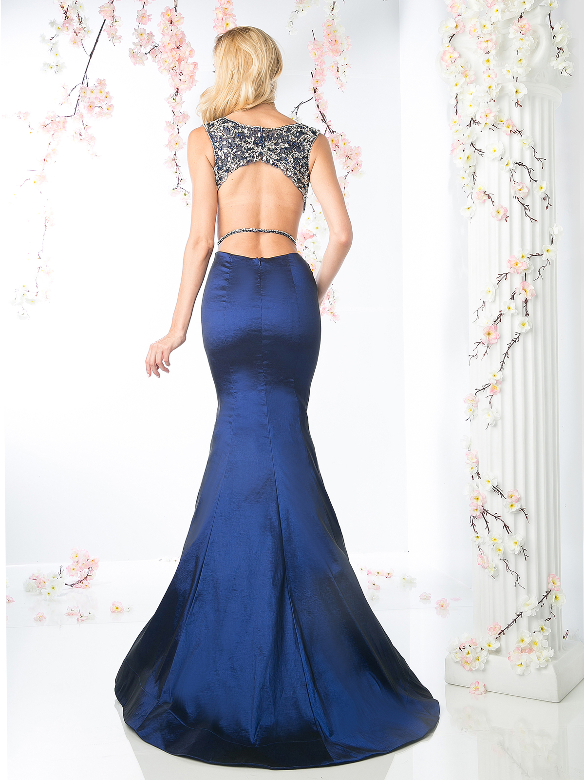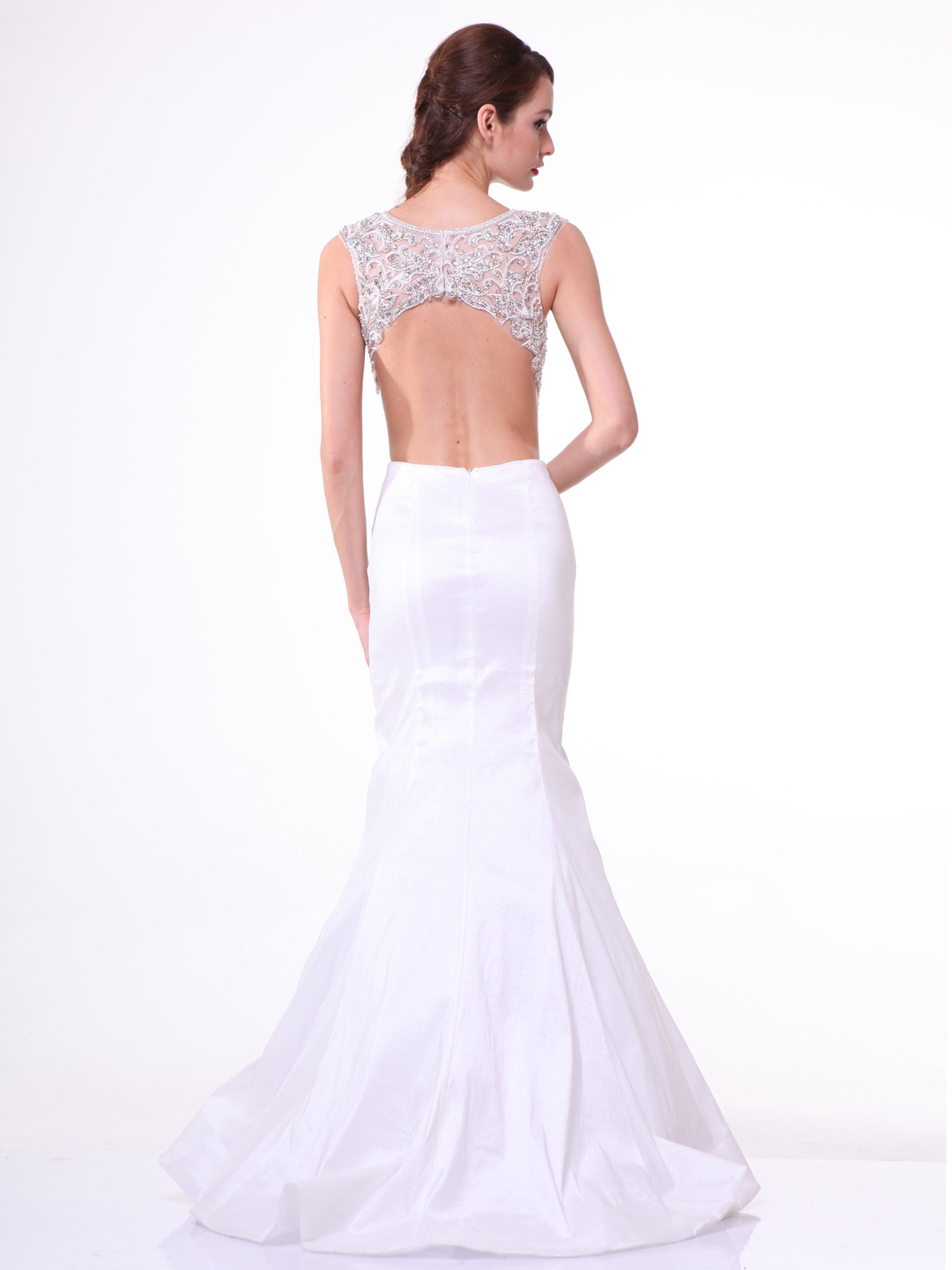 This low cut, sleeveless gown is refined and classic. It has a backless bodice that is covered in sequins and crystal beading for a shimmering appearance and the trumpet skirt finishes the look with classis elements of style and grace.