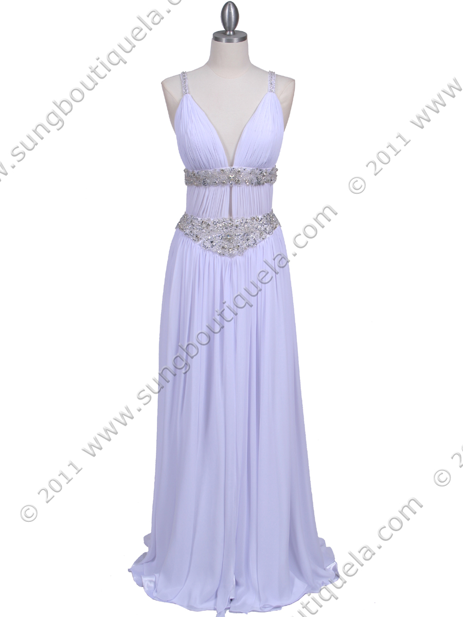 This gorgeous chiffon evening dress features sparkling jewels detail the deep v neckline and the waist. Straps tie behind the open back. Beautiful and elegant.