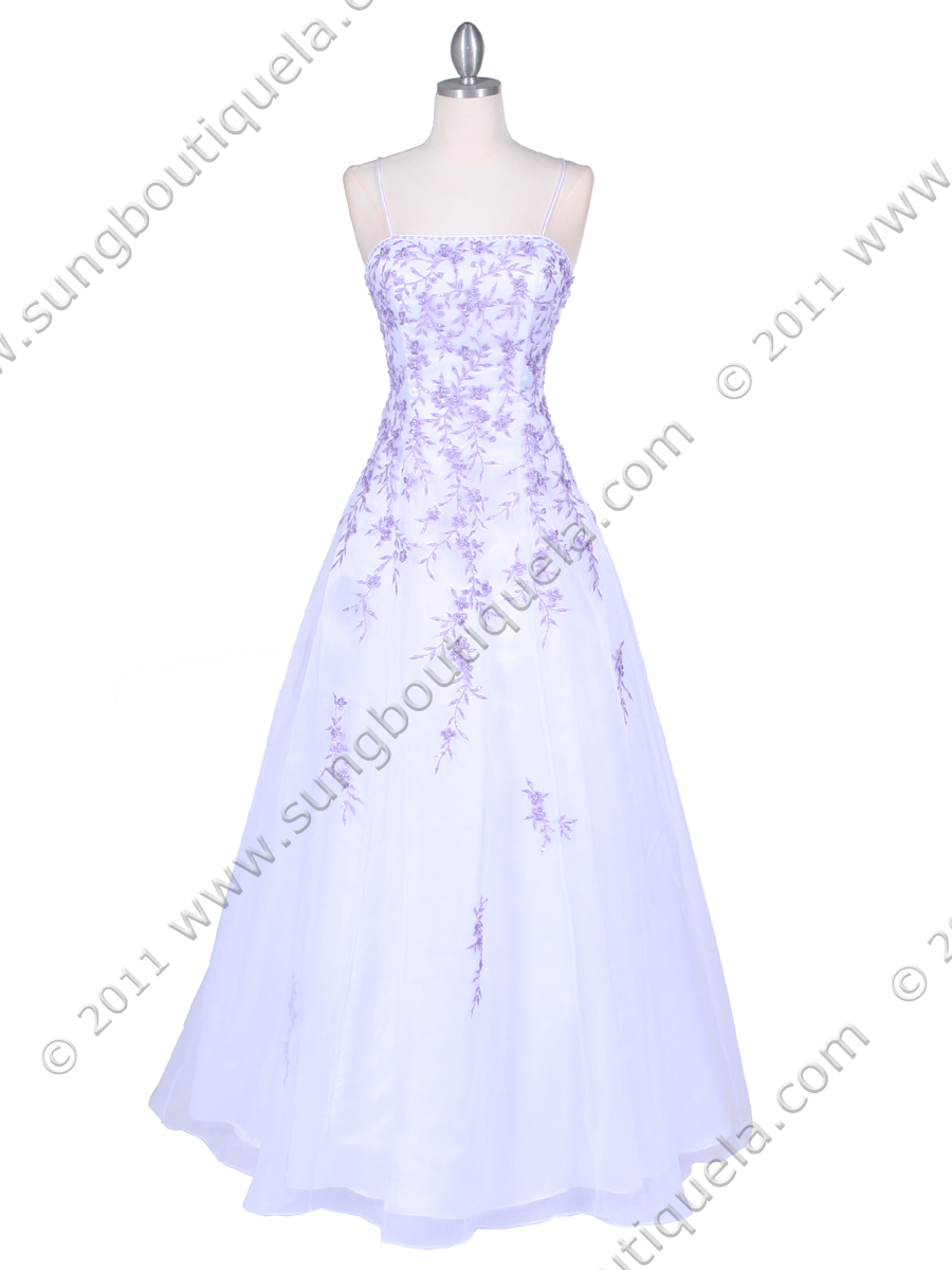 This elegant and glamorous evening gown features stunning and gorgeous flowery embroidery overlay white organza. Simple neckline with removable spaghetti straps. Crisscross back with lower back zipper closure ensure the perfect fit. Built in boning for shape and support. Matching shawl is included. Imported. Built-in cups. Shell and lining made from 100% polyester.