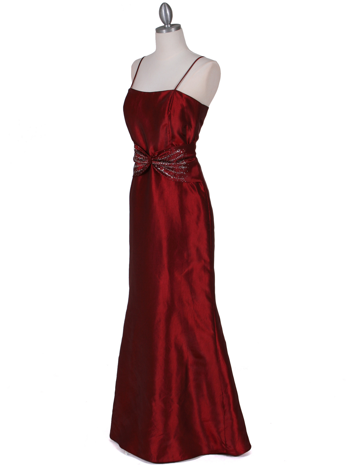 This beautiful two-piece taffetta evening dress features spaghetti straps with simple neckline. Glittering sequins details the waist. Slighty flattering A-line skirt with a bit longer in the back finishes the classic look. - Matching with three-quarter-sleeve bolero. - Back center zipper. - Padded bodice. - Approx. 58 in. from shoulder to hem. - Fully lined. - 100% polyester. - Imported.