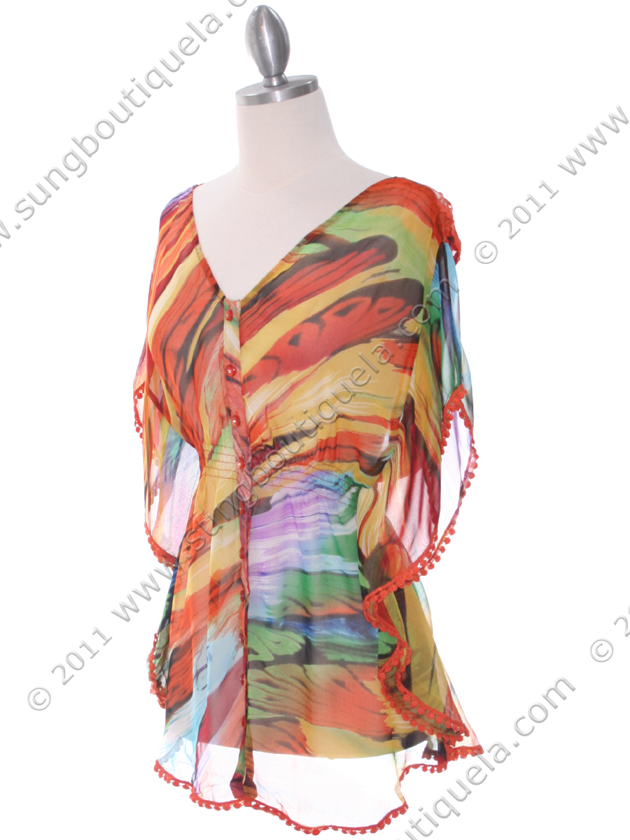 Beautiful abstract print chiffon top features crochet back. An elasticized waist finished the bohemian look. - Approx. length from shoulder: 27 inch. - 100% polyester. - Imported.